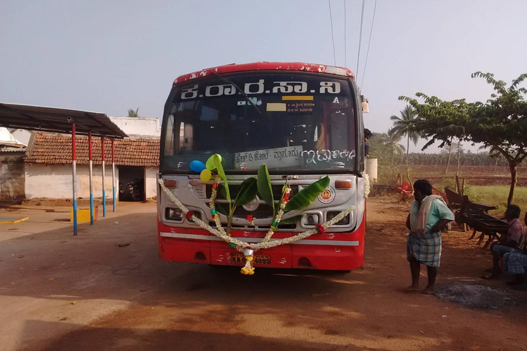 A KSRTC bus decorated with garlands and banana leaves by the community to mark the commencement of the new route in H.D. Kote Taluk